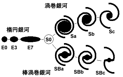 まず、楕円銀河ですが球形から楕円のつぶれが大きくなるにしたがってE0からE7まで細分されています。E7の次にあるのが、レンズ状銀河でこれはS0と表記されます。S0の次は渦巻銀河となりますが、バルジから明るい腕が外側に向かって巻きつくように伸びているのが渦巻銀河(S型)、バルジが棒状に伸びて、その両端から渦巻き腕が伸びているが棒渦巻き型(SB型)とし、さらにその腕の開きが大きくなるにしたがって、a,b,cの小文字をつけて細分化しています。
